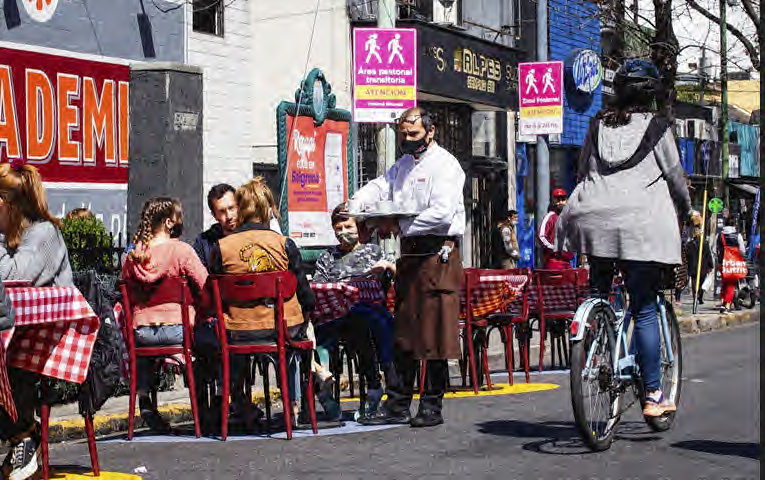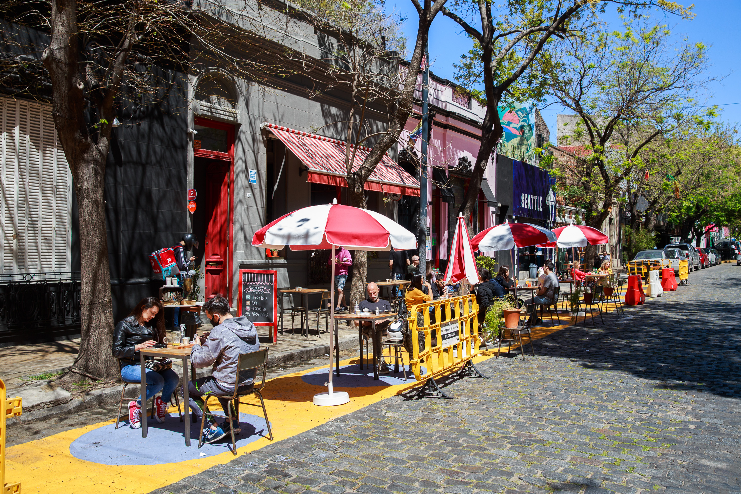 Se mantienen en la ciudad de Buenos Aires las calles cortadas al tránsito vehicular y con demarcaciones especiales para que los bares y restaurantes de la ciudad extiendan sus espacios, respetando el distanciamiento y cumpliendo los protocolos de seguridad.