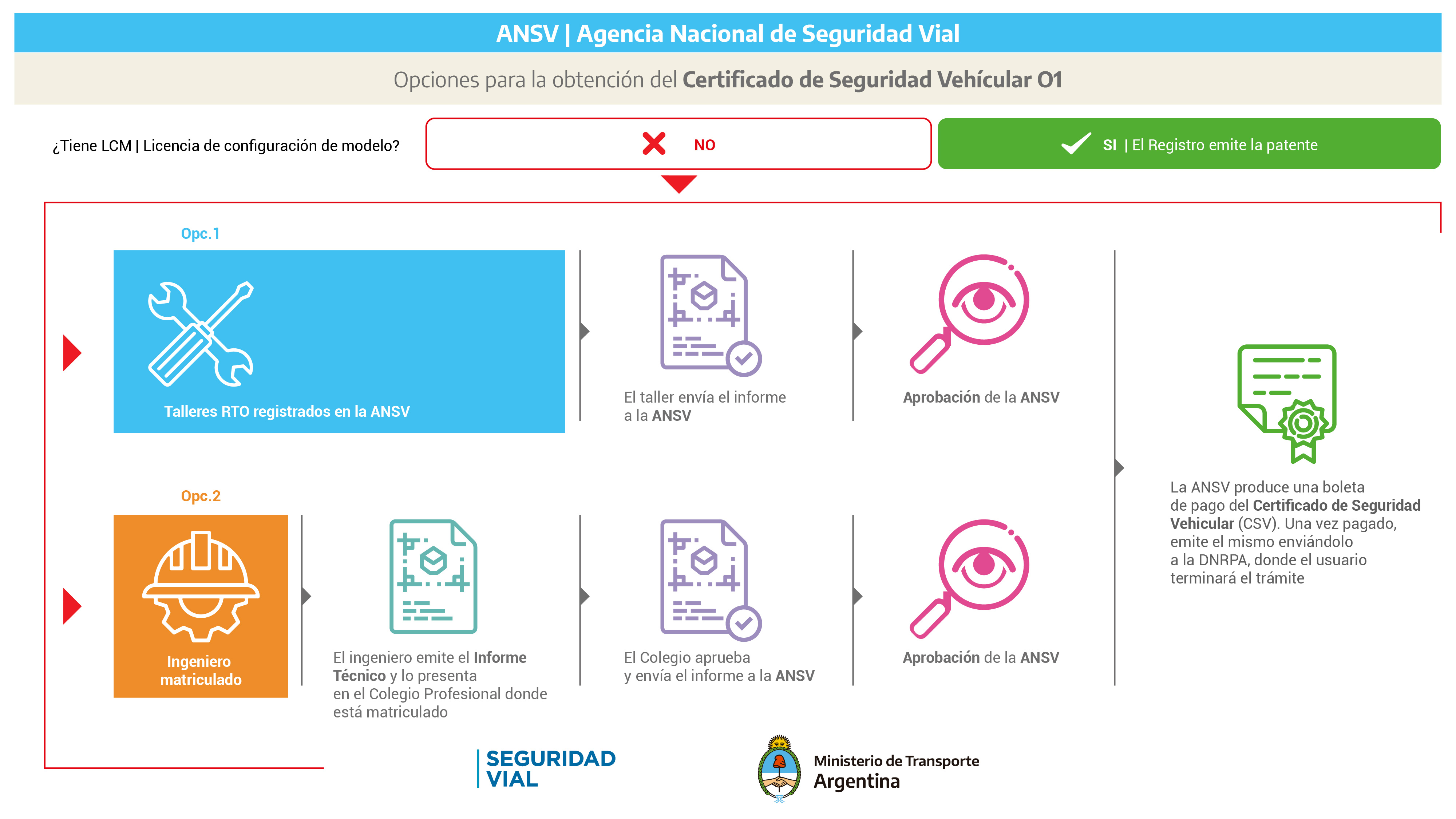 Una vez recibido el informe y aprobado por la ANSV, el organismo remitirá por correo electrónico una boleta de pago para que el interesado pueda abonar la certificación solicitada. Cuando la ANSV recibe el pago del Certificado, se envía el mismo directamente al registro seccional de la DNRPA en el que el propietario del vehículo inició el trámite y se lo notificará para que se dirija a dicho registro a fin de concluir con el patentamiento.