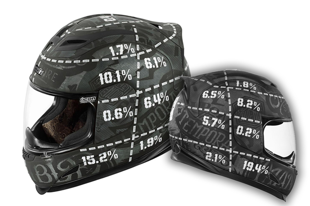 Llevar toda la cara desprotegida puede tener sus consecuencias y los estudios demuestras que la mentonera es la zona del casco que recibe un mayor número de impactos. De hecho, aquí tienes un casco diseñado por ICON donde se muestran los porcentajes de impacto por las diferentes zonas del casco. La mentonera recibe casi el 40% de todos ellos.