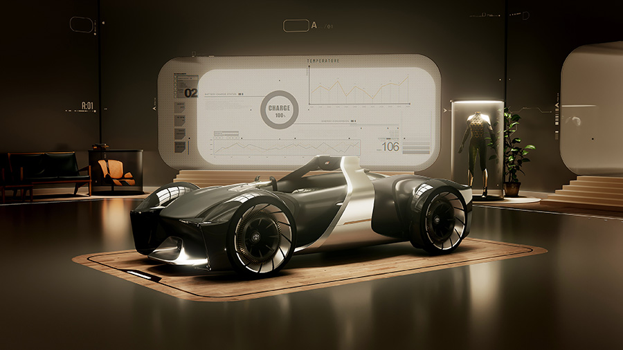 e-RACER Este vehículo representa el "fun to drive" del futuro. Con anteojos digitales especializados, los visitantes pueden disfrutar de la experiencia realista de un circuito de carreras a su elección y personalizar los asientos para que se adapten a la forma de su cuerpo.