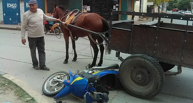 El impacto fue muy violento, por eso el caballo cayó encima de la moto, aplastando a sus dos ocupantes, quienes no llevaban casco de protección. "Fue un momento terrible, el caballo se movía y los chicos estaban atrapados con la moto y el animal encima, hasta que lograron sacarlo", dijo un testigo del hecho. Candela Soria de 18 años y su hermanito, quienes residen en Villa San José, sufrieron golpes y lastimaduras y fueron asistidos en el nosocomio. "Fue un accidente lamentable. Yo iba bajando por la Alvarado y los chicos se metieron nomás. Me asusté mucho y lo que más me preocupaba era sacar a los chicos. Gracias a Dios solamente se golpearon", dijo Luis Ricardo Craba, quien guiaba el carro. "Luego del choque entré al hospital para ver que la chica y el niño estuvieran bien", dijo. El animal se paró luego del siniestro vial y no sufrió lesiones de consideración tampoco. Craba aclaró: "Yo no hago fletes, trabajo para mí porque tengo un criadero de chanchos y lo único que hago es transportar alimentos para los animales. Sobre la polémica por la tracción a sangre en Metán, dijo que: "haremos lo que las autoridades decidan, no me voy a meter en eso". El año pasado, el Concejo Deliberante aprobó por unanimidad un proyecto de ordenanza del concejal, Raúl Moya, para tratar de erradicar en forma definitiva a los carros tirados por caballos y reemplazarlos por vehículos montacargas. "La iniciativa fue observada por el Ejecutivo por motivos económicos. Pero esta situación no puede continuar. Tengo conocimiento del terrible accidente y los momentos que se vivieron entre el choque de un carro con una moto", dijo el edil a El Tribuno. "Nuestra ciudad ya tiene más de 40.000 habitantes, ya no es un pueblo. Hay que ordenar el tránsito, la circulación de los carreros y contrarrestar la gran cantidad de animales sueltos que hay", indicó. "Si ocurre un accidente con una víctima fatal en el que esté involucrado un carro, seguramente el responsable solidario será el municipio. Por eso hay que tomar las medidas que corresponden, destacó Moya. El proyecto hacía mención, justamente, a hechos lamentables ocurridos en la vía pública, como por ejemplo, cuando un caballo que tiraba un carro se desplomó, lo cual causó profunda indignación en la gente. "El maltrato animal y la tracción a sangre van de la mano, siendo motivo de muchas manifestaciones y protestas de organizaciones sociales que defienden los derechos de los animales y de proteccionistas que luchan contra la violencia hacia éstos", destacó Moya. Se calcula que en San José de Metán hay unos treinta carreros en actividad, que se dedican a hacer fletes para el traslado de basura, escombros y otros elementos. Moya recordó que en febrero del 2016 se realizó una reunión con grupos proteccionistas que plantearon la problemática de la tracción a sangre y los caballos que deambulan a la deriva por la ciudad. La complejidad de la práctica de la tracción a sangre involucra asuntos no solo vinculados con la protección animal, sino también con la inclusión social, la dignidad de los trabajadores, el trabajo infantil, la movilidad y seguridad vial, entre otros aspectos fundamentales". La iniciativa señalaba necesario promover la dignidad laboral de las personas cuya fuente de trabajo se traduce en actividades de recolección, separación y acopio de residuos sólidos para su posterior venta. "Culturalmente esta práctica acarrea la participación de menores en el trabajo familiar para contribuir al ingreso económico, contrariando de esta manera a la Declaración Universal de los Derechos del Niño", remarcó Moya. El proyecto destaca que los equinos, como todos los animales, son seres vivos y con capacidad de sentir, de diferenciar el placer del sufrimiento, y el tratarlos y considerarlos como meras cosas no solo contradice el conocimiento científico sino también los valores éticos. "Los carros impulsados por caballos además de obstaculizar el tránsito, han sido y son aún, vehículos involucrados en accidentes viales evitables, debido a la ausencia de un sistema de seguridad con el que cuentan otros vehículos, como frenos, luces y seguro contra accidentes", remarcó. Al tomar conocimiento del proyecto, varios carreros de Metán se opusieron al cambio de los carros por motocargas.