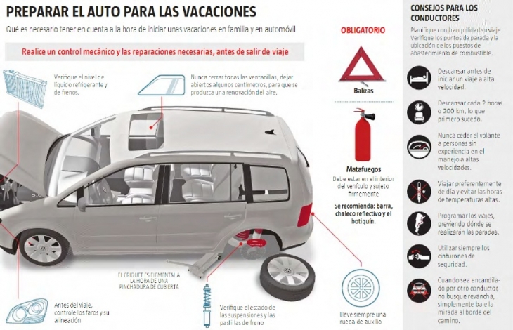 Por otro lado, antes de comenzar el viaje, hay que chequear tener al día la documentación obligatoria como la licencia de conducir vigente, el Documento Nacional de Identidad, la cédula verde del auto o la cédula azul si conduce un vehículo que no es de su propiedad, asegurarse que las patentes estén legibles y tener en cuenta las siguientes consideraciones: _Puesta a punto del vehículo: tener el service al día para garantizar la seguridad del auto.